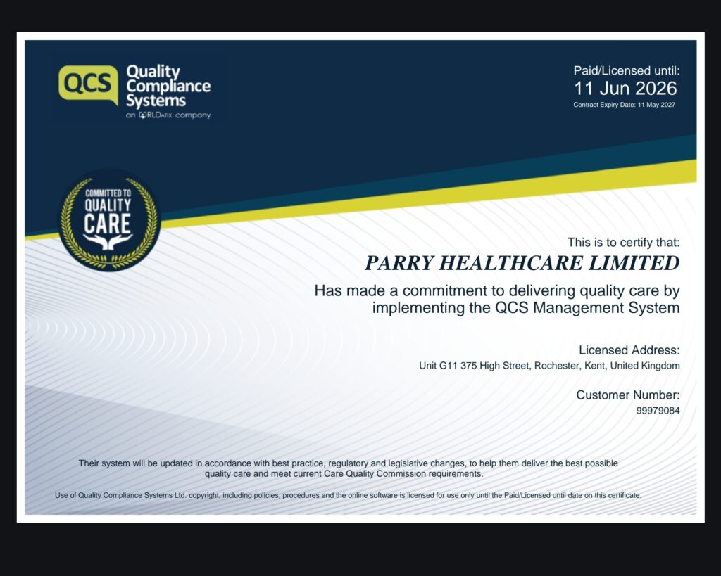 We are Quality Compliance System Certified, showing our dedication to the highest standards of healthcare quality and safety. Our commitment to ongoing staff training ensures we meet all our service users’ needs and you can trust that we provide exceptional healthcare services.